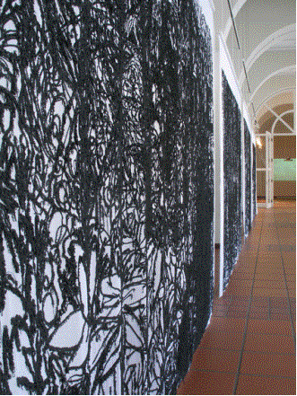 | "Wald", montanaberlin, Berlin, 2007, weiße Gaze, schwarzes Acryl, Leiste, Schnur, |